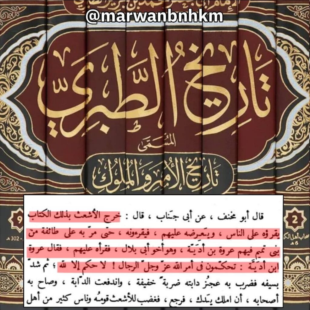 وورد في رواية أخرى لأبي مخنف نفسه أن أول من حكم عروة بن أدية بعد انتهاء المفاوضات مع معاوية وقراءة كتاب القضية عليهم وتنازلات علي التي قدمها، فهو يحاول في رواية أن يبرر تنازلات علي بحدوث الانشقاق بينما تثبت روايات أخرى له ولغيره أن الخوارج لم ينشقوا إلا بعد أن تنازل علي!