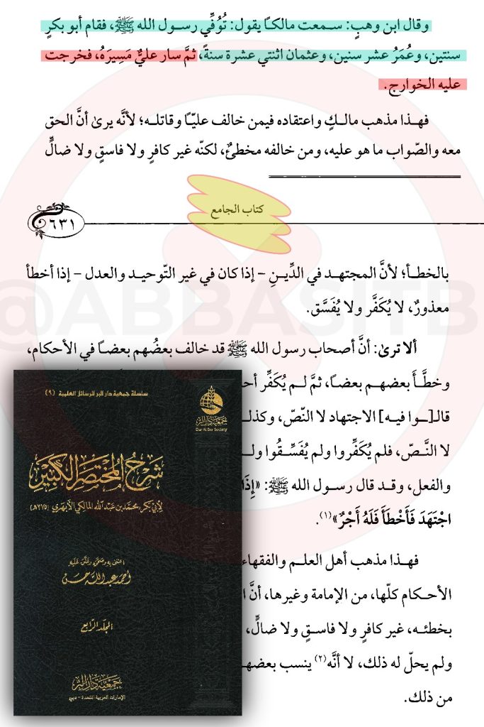 (توفي رسول الله ﷺ فقام أبو بكر سنتين، وعمر عشر سنين، وعثمان اثنتي عشرة سنة، “ثم سار علي مسيره، فخرجت عليه الخوارج”).