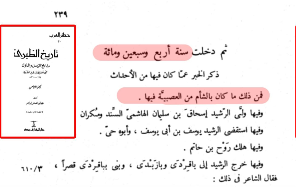 - قال الطبري: “فمن ذلك ما كان بالشام من العصبية فيها”1