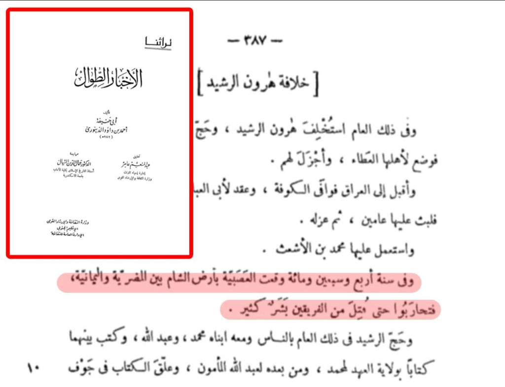 وقوله “أيام العصبية” يدل على أن أهل ذلك العصر عرفوا تلك الأحداث بهذا الإسم أي بأحداث العصبية. - وقال أبو حنيفة الدينوري: “وفي سنه اربع وسبعين ومائة وقعت العصبية بأرض الشام بين المضرية واليمانيه، فتحاربوا حتى قتل من الفريقين بشر كثير”4