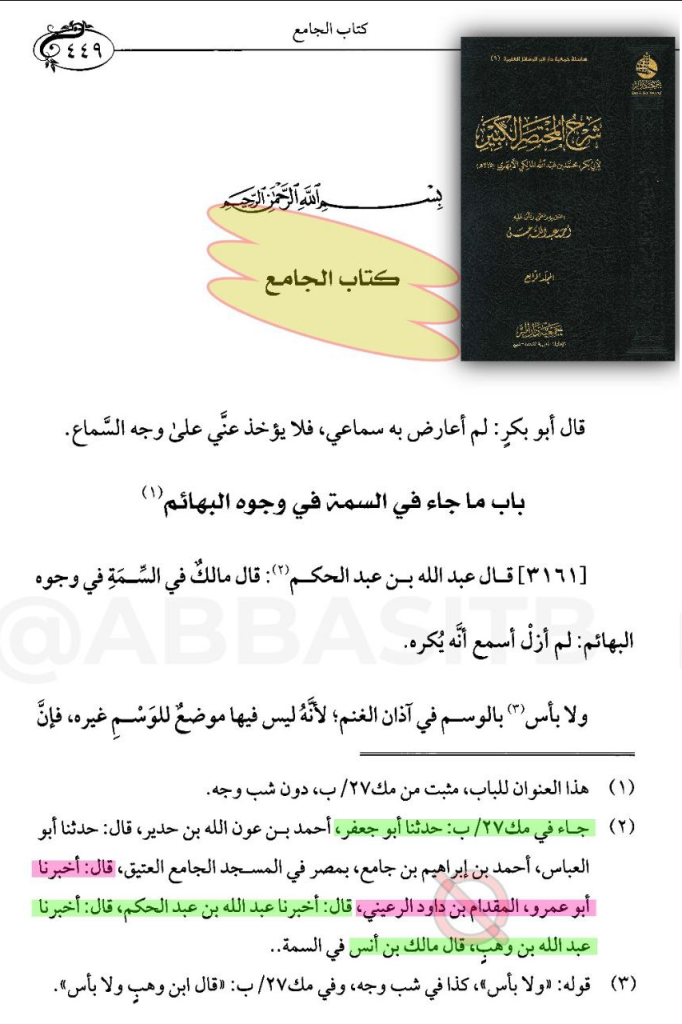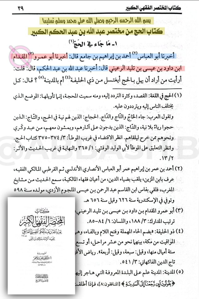 وهذا سند الكتاب الأصلي: “المختصر الفقهي الأكبر لابن عبد الحكم” الذي شرحه الأبهري العراقي:- في بداية الكتاب: (ما جاء في الحج) يذكر سند الكتاب إلى ابن عبد الحكم -تلميذ مالك- ومدار سند الكتاب على هذا الراوي الكذاب: