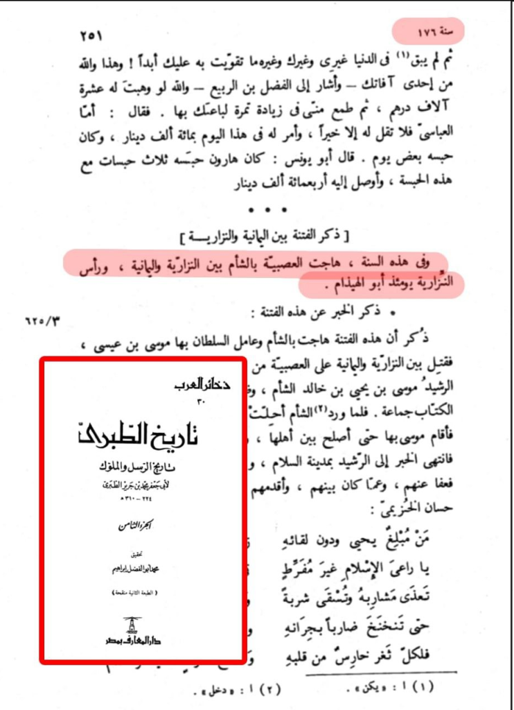 - 2- قال الطبري: “وفي هذه السنة، هاجت العصبية بالشام بين النزارية واليمانية، ورأس النزارية يومئذ أبو الهيذام”2