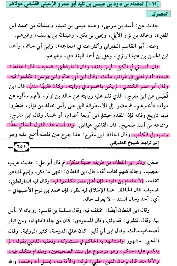 ففي سنده :- (أبو عمرو المقدام بن داود الرعيني مولاهم المصري). –